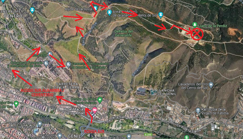 El acceso al punto de salida es por la pista principal al Parque de Invierno, por el Cementerio de Granada. Ojo que el punto en el maps hace la entrada por Cenes y no es correcto.